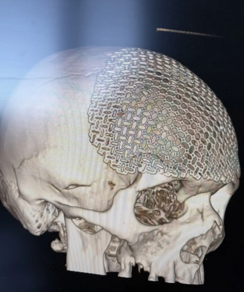 Для восстановления дефекта костей черепа по 3д модели пациента был изготовлен титановый имплантат, который хорошо приживается в организме человека. Материал используют благодаря его свойствам: биосовместимости, прочности, лёгкости, нейтральности к температурам и коррозии, совместимости с диагностикой.